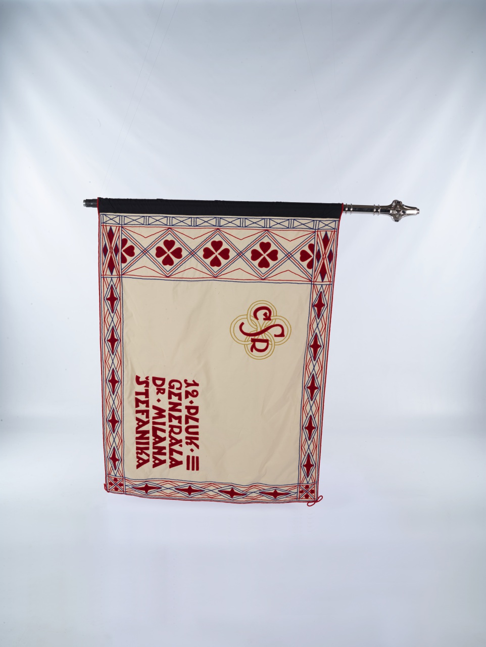 Rubová strana je zhotovená z textilu červenej farby a orámovaná textilom krémovej farby. V ľavej strane červeného poľa zástavy je vyšitý znak Čiech – strieborný (biely) dvojchvostý lev so zlatou korunkou. V pravej časti červeného poľa sú zvisle umiestnené v dobovom prevedení farebné krajinské znaky Slovenska, Moravy a Sliezska. Okolo sú umiestnené výšivky bielych lipových lístkov s ornamentmi rovnakej farby. Zástava je upevnená na dvojdielnej drevenej žrdi morenej na čierno, ukončenej strieborným palcátom.