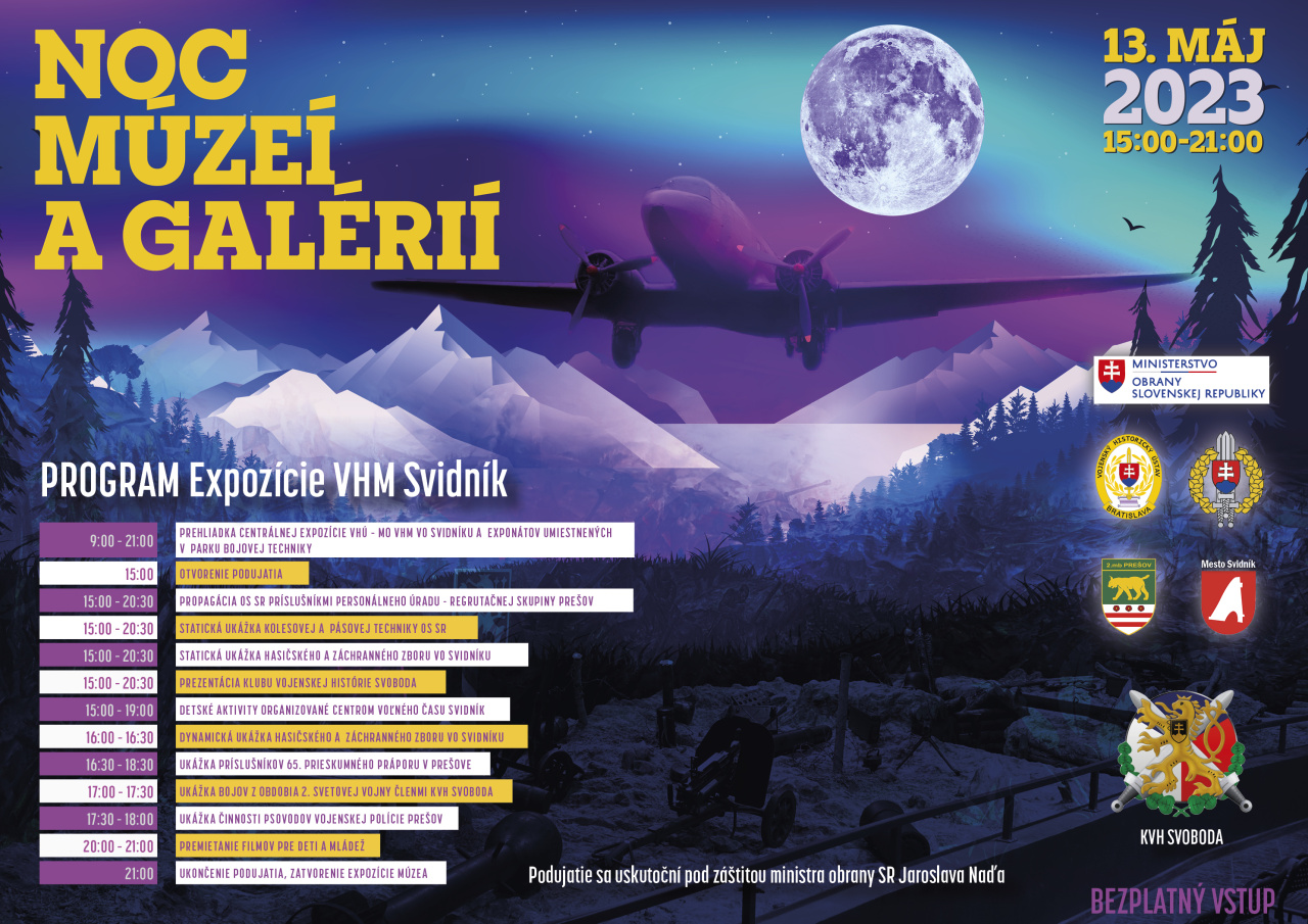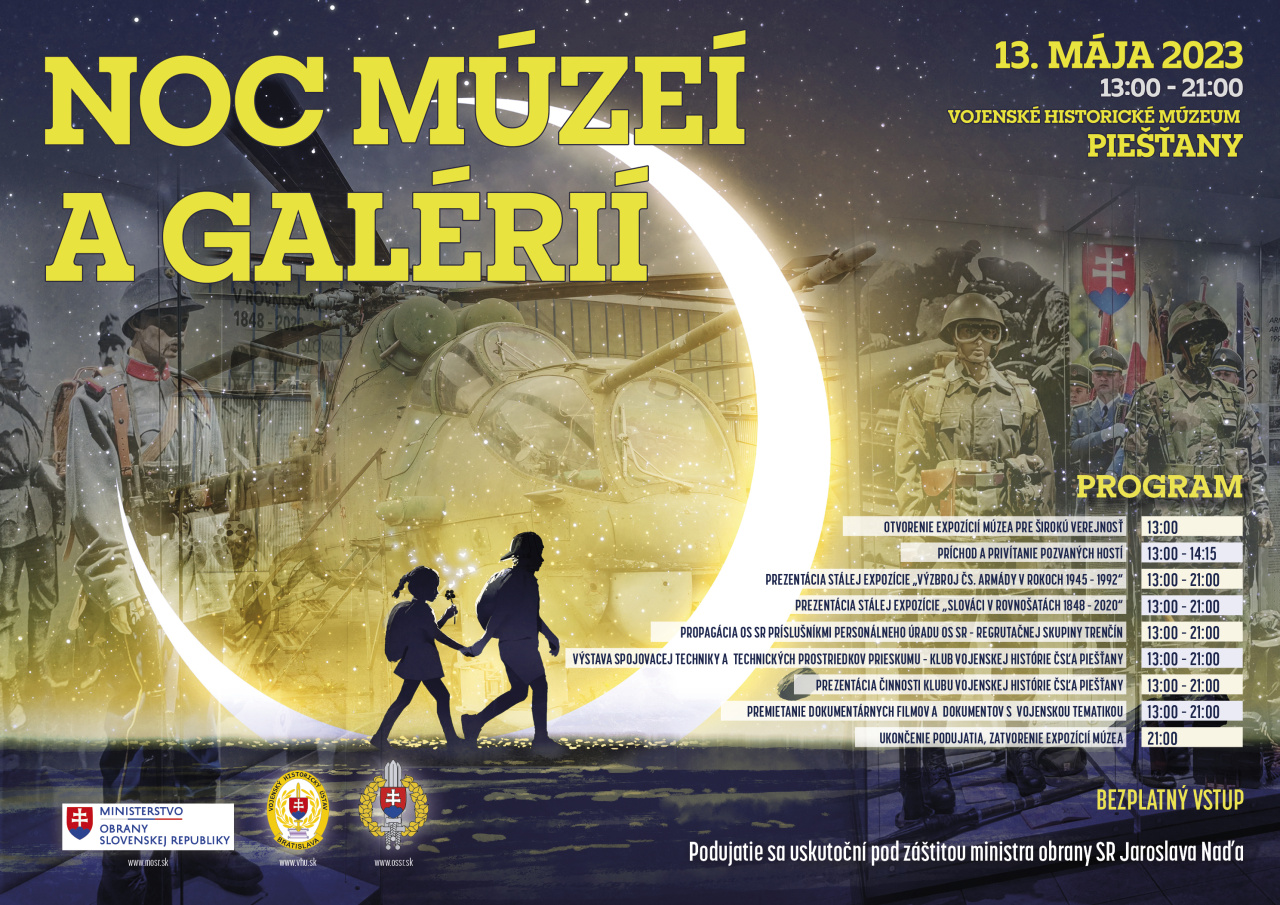 19. ročník podujatia Noc múzeí a galérií 2023 sa uskutoční v jeden deň na celom Slovensku, pri príležitosti Medzinárodného dňa múzeí. Návštevníci Vojenského historického múzea (ďalej len „VHM“) sa budú môcť v priestoroch Múzejného oddelenia Piešťany a Múzejného oddelenia Svidník oboznámiť so zmodernizovanými expozíciami približujúcimi vojenskú minulosť Slovenska. Pre návštevníkov podujatia bude pripravený bohatý kultúrno-spoločenský program. Zároveň je pre fanúšikov vojenskej histórie pripravený veľmi bohatý program v online priestore VHÚ.