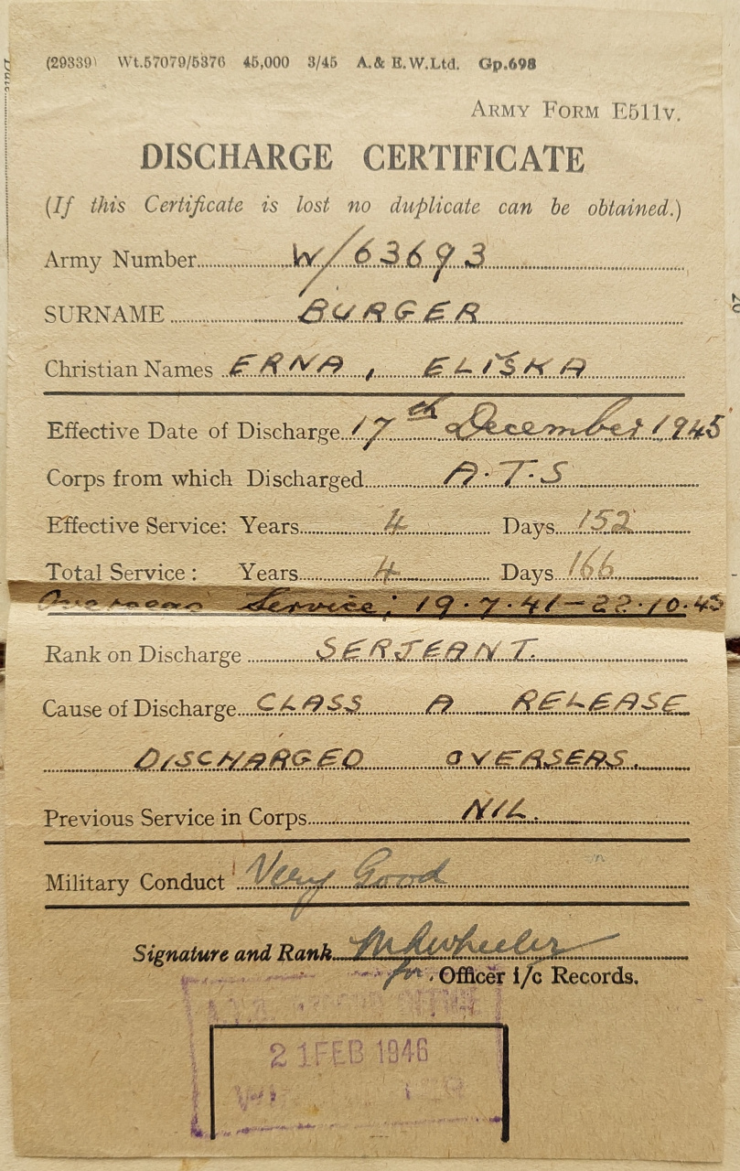 Medzi riadnych členov Československého ústavu patrila aj Erna Eliška Bürgerová, rod. Schultz, ktorej pozostalosť sa do fondu Vojenského historického múzea Piešťany dostala začiatkom tohto roka. Narodila sa 13. júla 1911 v Berlíne. Po sobáši s Ľudovítom Bürgerom z Vrútok, pod vplyvom udalostí emigrovala z Československa už ako československá občianka v roku 1939 do Veľkej Británie. Ernin silne protifašistický svetonázor sa ani počas ročného pobytu v Británii nezmenil a aj tu hľadala možnosti, ako by mohla prispieť a zapojiť sa do odboja. Tak ako viaceré ženy s československými koreňmi, aj ona chcela vstúpiť do jednotiek čs. zahraničnej armády. Ženské oddiely čs. zahraničného vojska však nakoniec neboli vo Veľkej Británii vytvorené. Po roku príležitostných prác v domácnostiach preto Erna na odporúčanie Ministerstva vnútra ČSR v Londýne a Veľvyslanectva ČSR v Londýne 5. júla 1941 vstúpila do ženských oddielov britskej armády – tzv. Auxuliary Territorial Service.