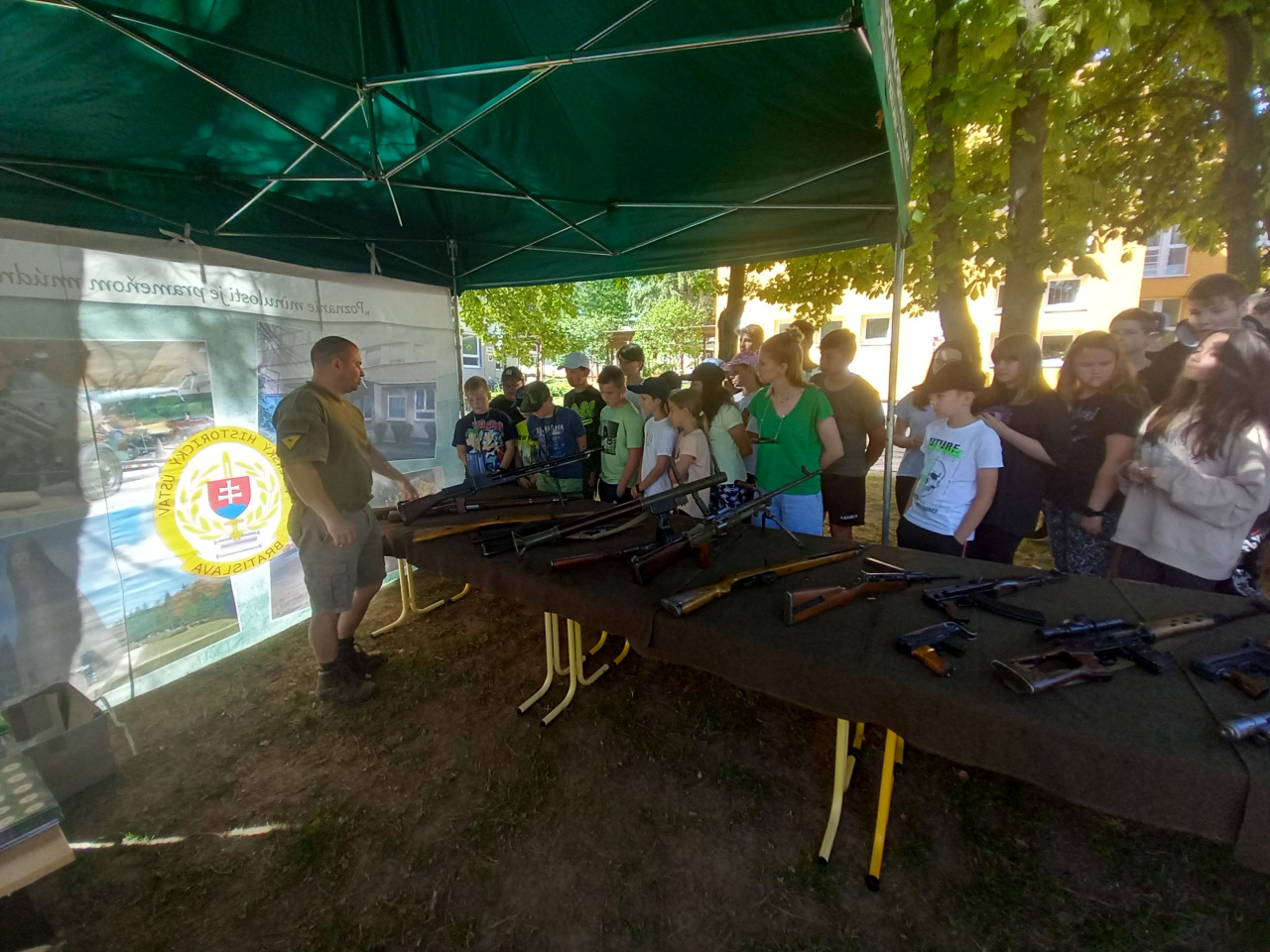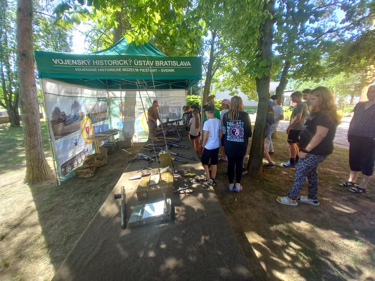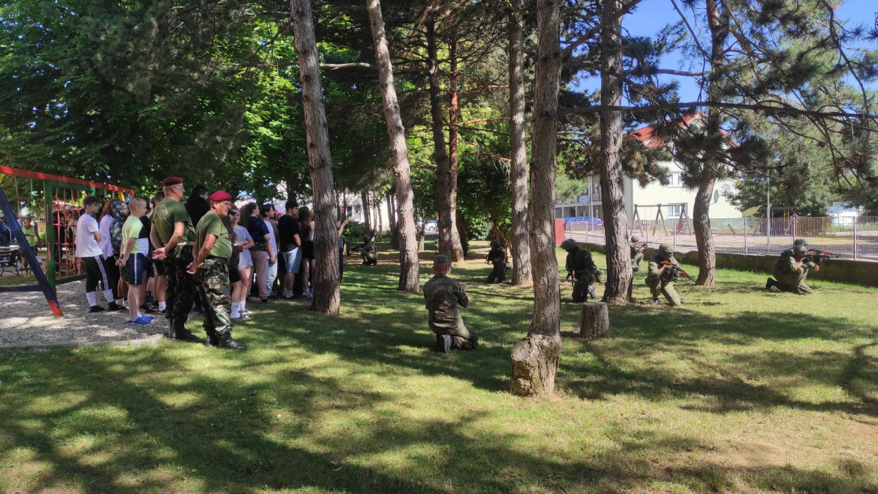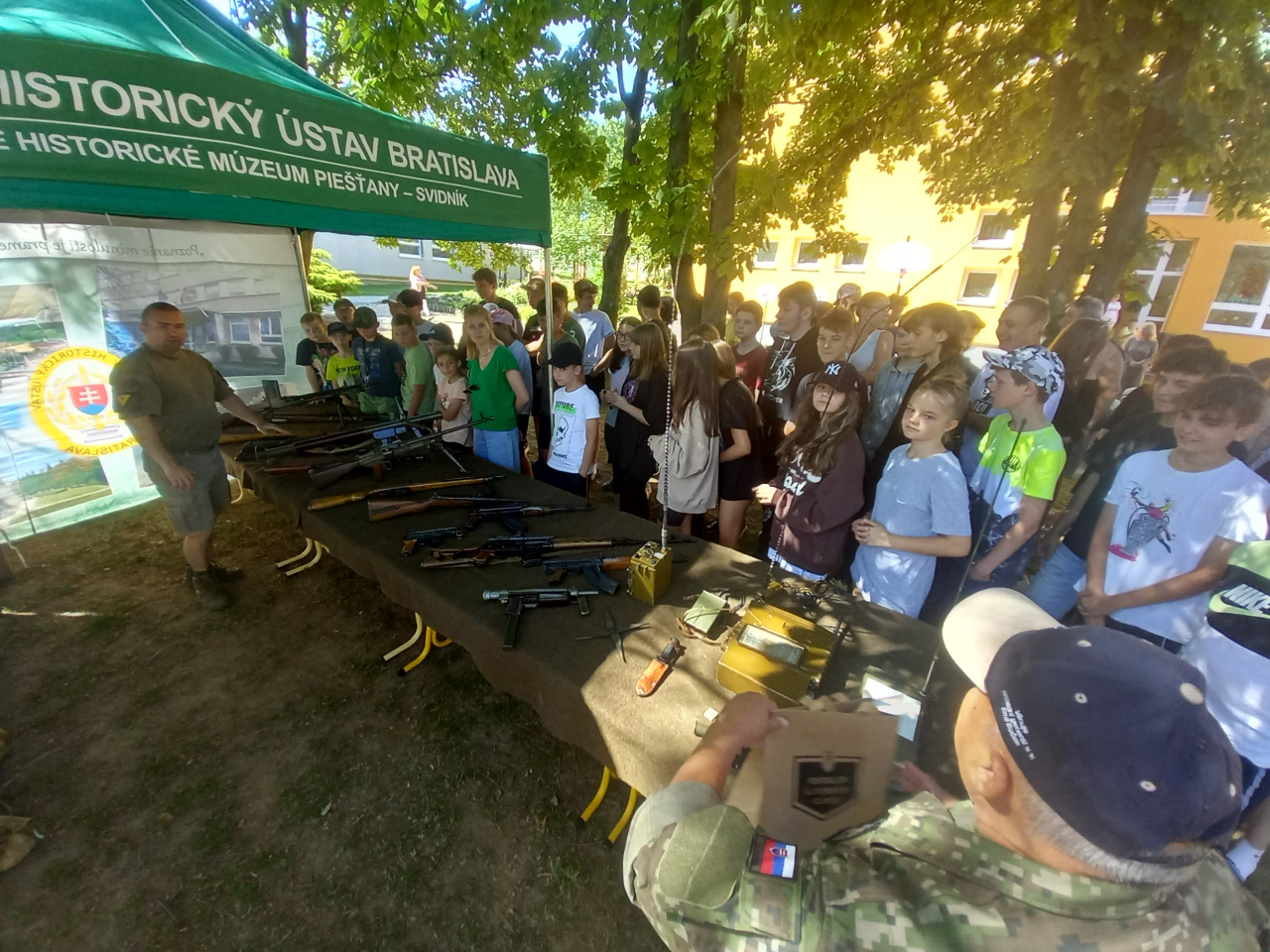 Príslušníci Čestnej stráže Ozbrojených síl SR v rámci zaujímavého programu predviedli vo vonkajších priestoroch základnej školy slávnostný pochod a mnoho atraktívnych cvikov so zbraňou. Ich druhou ukážkou bolo zaistenie ozbrojeného páchateľa s použitím sebaobrany a celej rady bojových prvkov, ktoré deti s nefalšovaným záujmom sledovali. Jedným z účastníkov akcie bol aj Vojenský historický ústav, ktorý zastupovali naši vojenskí múzejníci z pracoviska v Piešťanoch. Úlohou našich vojenských múzejníkov bolo priblížiť deťom vojenskú výzbroj, výstroj a techniku, ktorú používali armády na území Slovenska od vzniku Československej republiky až po súčasnosť. Medzi iným im ukázali aj historickú spojovaciu techniku výsadkových a prieskumných jednotiek. Deti sa oboznámili aj s „mínohľadačkou“, ktorá patrila medzi technické prostriedky ženijného vojska. Malí záujemcovia o vojenskú minulosť Slovenska dostali možnosť „poťažkať“ si zbierkové predmety – delaborované ručné palné zbrane. No atrakciou prezentácie sa stalo pozorovanie priestoru pomocou periskopu pre prieskumníkov. Žiaci dostávali počas návštevy nášho prezentačného stánku rôzne otázky z vojenských dejín Slovenska a za správne odpovede boli odmenení prezentačnými materiálmi z dielne Ministerstva obrany SR a Vojenského historického ústavu. Múzejníci pri práci s miestnymi deťmi zúročili znalosti, ktoré získali prostredníctvom mnohopočetných návštev ich vrstovníkov v stálych expozíciách piešťanského Vojenského historického múzea. Na podujatí bol priblížený aj život príslušníkov Ozbrojených síl SR pôsobiacich na zahraničných misiách. Prispela k tomu aj prezentácia knihy pod názvom Plukovník OSN, ktorú deťom predstavil jej autor pplk. v. v. Dr. Bernard Roštecký, pričom niekoľko výtlačkov knihy daroval miestnej škole. Pri príležitosti tohto podujatia venoval minister obrany Jaroslav Naď škole rozsiahlu publikáciu Vojenské dejiny Slovenska a Slovákov, ktorú spracoval kolektív autorov Vojenského historického ústavu. Program obohatili aj príslušníci Klubu vojenských výsadkárov Banská Bystrica s praktickou ukážkou padáka, a podelením sa s mnohými príbehmi zo života výsadkárov. Po moderátorovom ukončení podujatia nasledovalo poďakovanie riaditeľky základnej školy i starostu obce za zaujímavý program, ktorý zvýšil historické povedomie nielen žiakov a ich rodičov, ale aj zamestnancov školy.