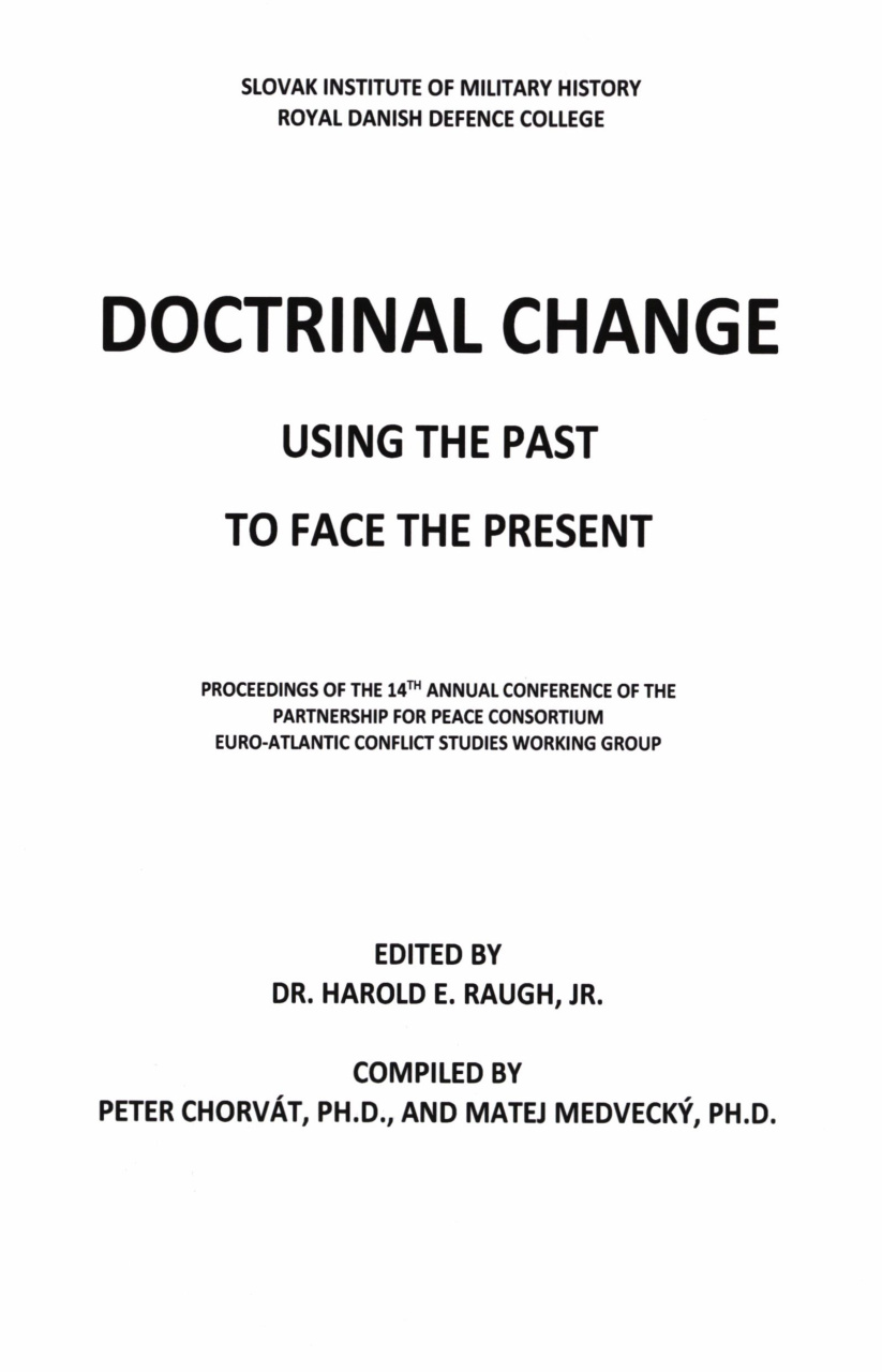 Doctrinal Change. Using the Past to Face the Present: Proceedings of the 14th Annual Conference of the Partnership for Peace Consortium Euro-Atlantic Conflict Studies Working Group. Ed.: RAUGH, Harold E.; Comp.: CHORVÁT, Peter – MEDVECKÝ, Matej. Bratislava – Kodaň : Slovak Institute of Military History – Royal Danish Defense College, 2015, 160 p.