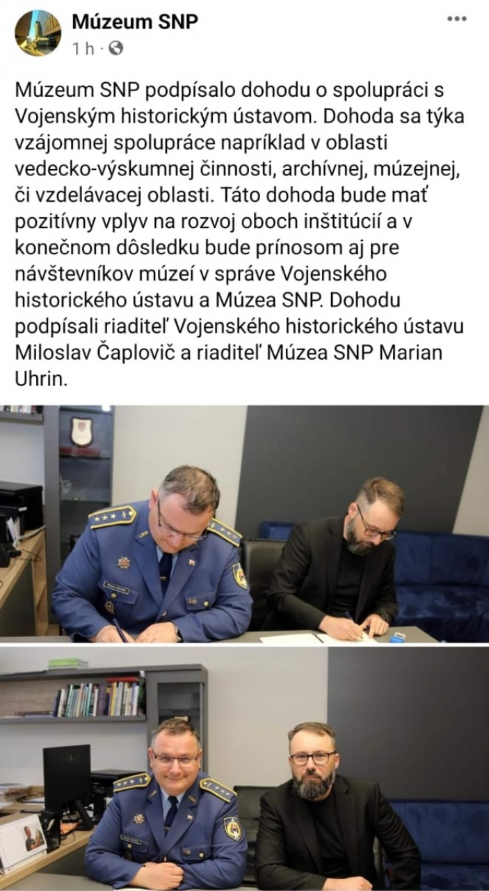 Dohodu podpísali riaditeľ Vojenského historického ústavu plk. Miloslav Čaplovič a riaditeľ Múzea SNP Marian Uhrin.