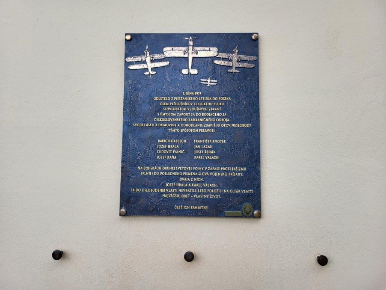 - umelecká výroba a osadenie pamätnej tabule v priestore Haly 1, venovanej ôsmim príslušníkom leteckého pluku slovenských vzdušných zbraní, ktorí 7. júna 1939 odleteli z piešťanského letiska do Poľska, s odhodlaním zapojiť sa do rodiaceho sa československého zahraničného odboja.