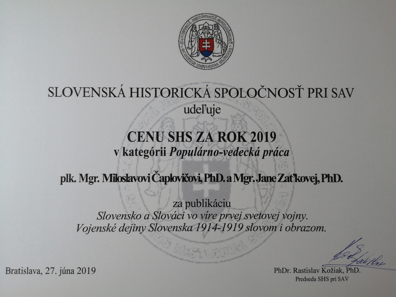 Cenu Slovenskej historickej spoločnosti si za účasti študentov histórie a vedecko-pedagogických pracovníkov Prešovskej univerzity prevzali obaja autori, pracovníci Vojenského historického ústavu v Bratislave, Miloslav Čaplovič a Jana Zaťková.