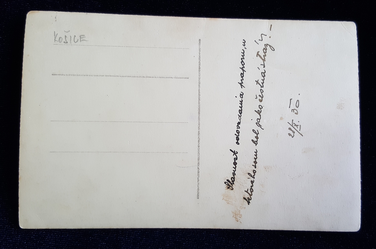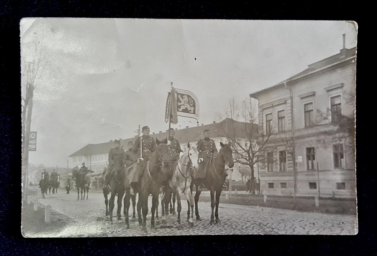 Pohľadnica s fotografiou vojakov na koňoch počas prehliadky ulicami Košíc vznikla pri príležitosti slávnostného odovzdávania bojovej zástavy Delostreleckému pluku 11 v Košiciach 28. októbra 1930. Sprievod bol odfotený pri prehliadke ulicami mesta na rohu ulíc Rákociho okružná a Štúrova okružná (dnešná križovatka Moyzesovej a Štúrovej ulice), v pozadí je rozľahlá budova súčasného Krajského riaditeľstva Policajného zboru SR. Pohľadnica je vytlačená na tvrdom papieri s rozmermi 139 x 88 mm. Plnila najmä spomienkovú funkciu, keďže jej pôvodný majiteľ (neznámy) sa ako osobná stráž zúčastnil na slávnostnom akte. Do zbierkového fondu múzea bola zaradená v roku 2019.