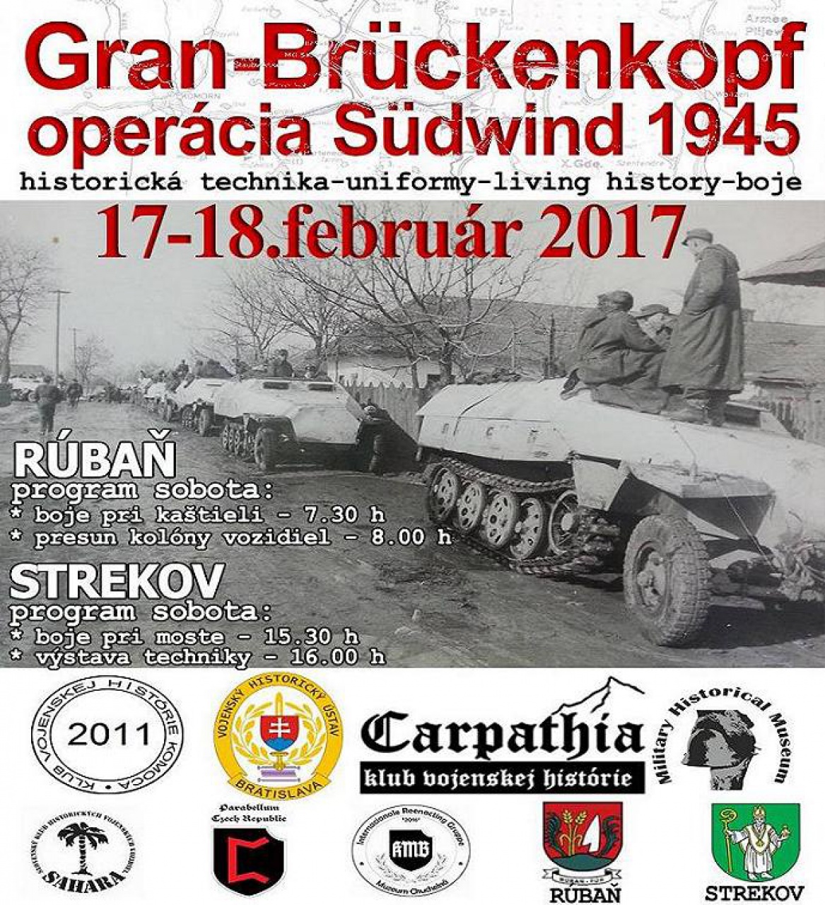 Občianske združenie KVH Carpathia Malacky a KVH Komoča Nové Zámky si Vás dovoľuje pozvať na podujatie Sudwind z roku 1945 z obdobia 2. svetovej vojny. Cieľom tohto podujatia pod názvom "Gran-Brückenkopf/Südwind 1945" je priblížiť udalosti z februára 1945, kedy v oblasti obcí Rúbaň a Strekov došlo k veľkým bojom medzi sovietskou armádou a nemeckými jednotkami. Termín podujatia je 17. – 18. február 2017. V rámci podujatia sa uskutoční rekonštrukcia bojov pre verejnosť.