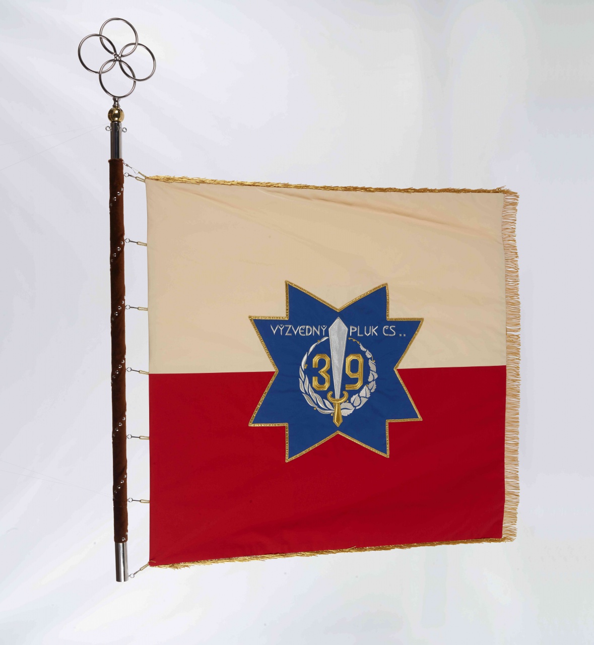 Zástava je vyrobená z hodvábneho vlajkového ripsu s rozmermi 1 200 × 1 220 mm. Rubovú i lícnu stranu zástavy tvoria dva pozdĺžne pruhy béžovej a červenej farby v pomere 1:1. V strede lícnej strany je umiestnená modrá nepravidelná osemcípa hviezda s vencom, arditským útočným nožom a číslom „39". V hornej časti hviezdy je vyšitý názov pluku „VÝZVĚDNÝ PLUK ČS".V strede rubovej strany zástavy je umiestnený kruh vyšitý bielym hodvábom, v ňom zlaté lipové listy so striebornými lipovými plodmi. V strede kruhu sú zlatou niťou vyšité písmená „ČS" a okolo nich umiestnené štyri zemské znaky – český, sliezsky, slovenský a moravský. Zástava je z troch strán ukončená zlatými strapcami a siedmimi látkovými pútkami so striebornými karabínkami, ktorými je pripevnená k žrdi. Žrď zástavy je potiahnutá hnedým zamatom. Hrot zástavy tvoria štyri veľké spojené kruhy striebornej farby.