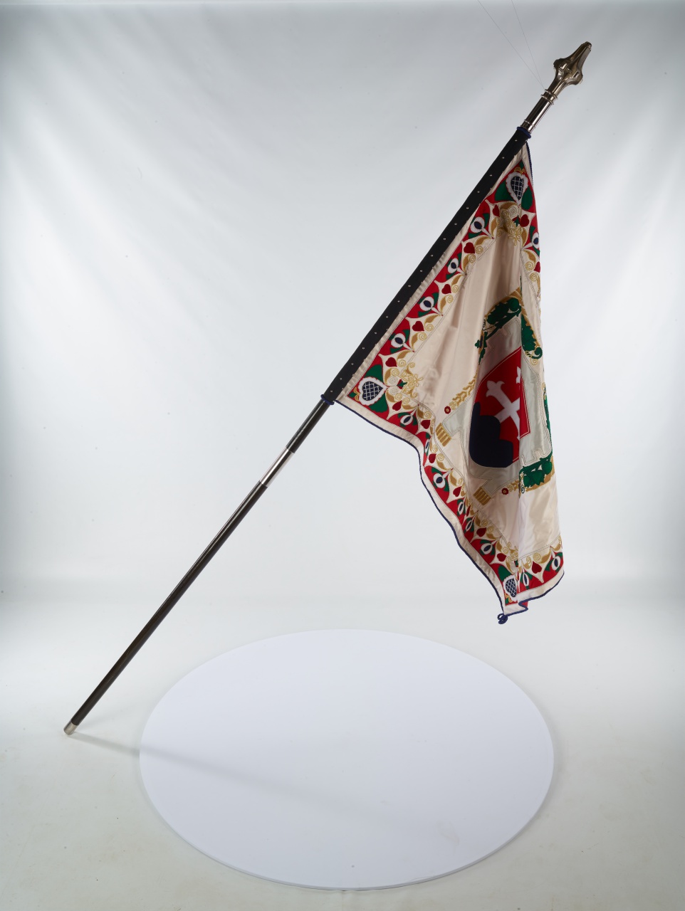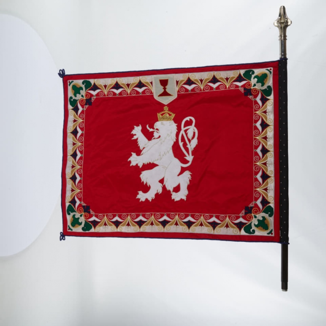 Replika zástavy je obdĺžnikového tvaru s rozmermi 1 000 × 1 300 mm, vyrobená z hodvábneho vlajkového ripsu s aplikáciami z fi lcu, ripsu a hodvábu. Lícna strana je vyhotovená z béžového hodvábu, v strede zástavy je vyobrazený slovenský štátny znak, ručne obšitý farebnými a kovovými šujtášmi. Okolo znaku je bohaté zdobenie z fi lcu a ripsu. Rubová strana je vyhotovená z červeného hodvábneho ripsu s bohato dookola zdobeným lemom s ornamentmi z fi lcu, ripsu a hodvábu, zhotovenými aplikačnou technikou a ručným obšívaním. Do stredu je položený biely lev z fi lcu, ručne obšitý kovovým šujtášom, so zlatou brokátovou korunou zdobenou zlatými perličkami. Zástava je k žrdi pripevnená čiernym tunelom, podbitým striebristými klincami pozdĺž v piatich zvislých radách. Dookola je lemovaná modrou točenou šnúrou. Žrď je svetlo morená, dvojdielna, s kovaním, navrchu zakončená hrotom. Hrot je vyrobený v tvare palcátu v striebristom prevedení.
