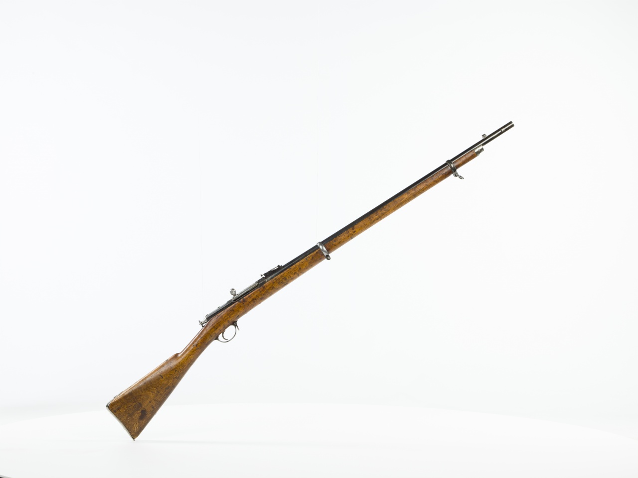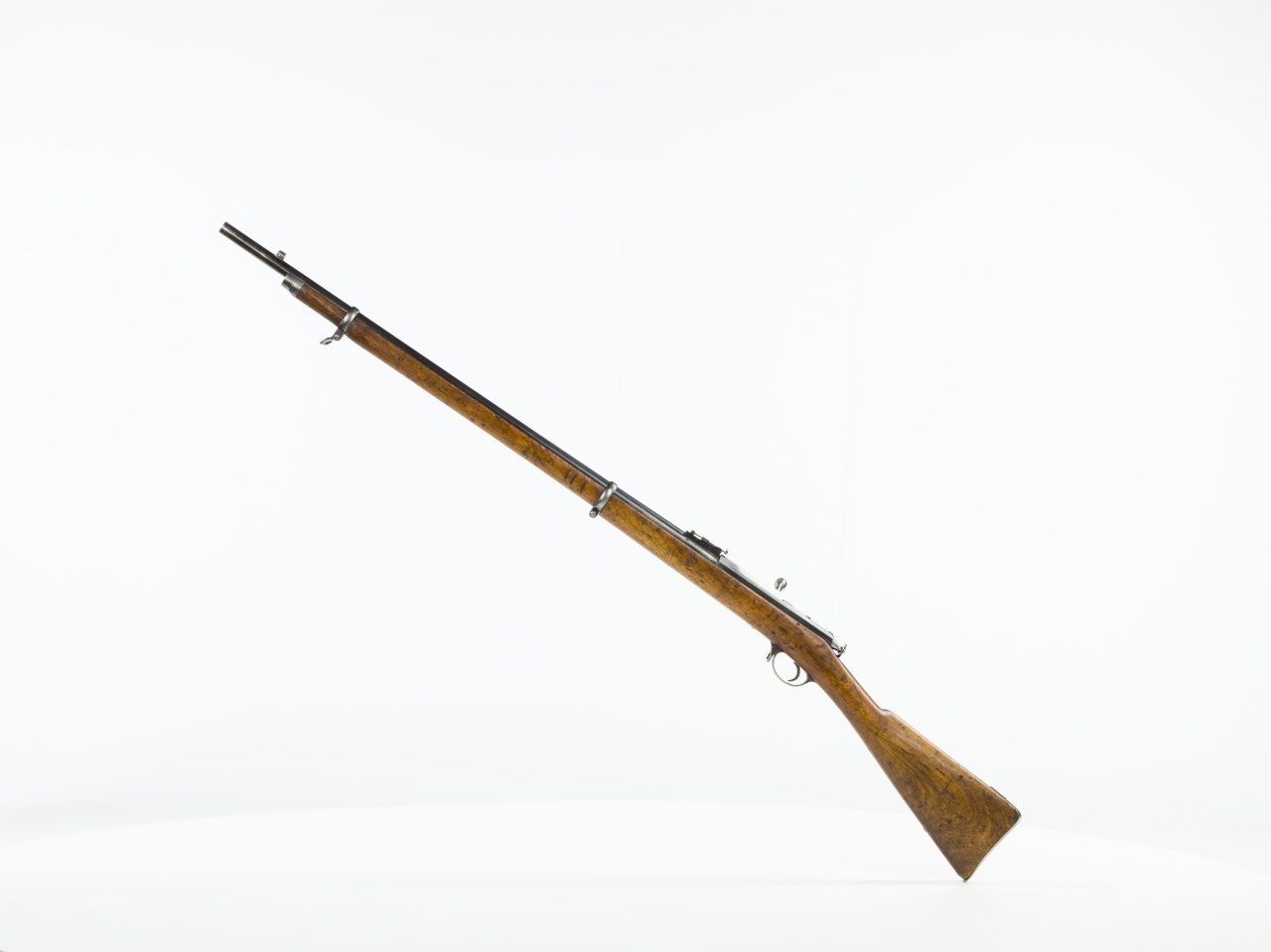 Zobrazená 10,6 mm ruská pechotná puška Berdan II. model 1870 bola vyrobená v roku 1884 v Sestrorecku. Bola konštrukčným dielom amerického plukovníka Hirama Berdana a dovýzbroje armády cárskehoRuska ju zaviedli v septembri 1870. Nahradila pušku Berdan I., ktorá bola do výzbroje narýchlo zavedená len dva roky predtým (1868), ale neosvedčila sa.Z konštrukčného hľadiska predstavovala puška Berdan II. zadom nabíjanú zbraň s valcovitým otočno-posuvným záverom. Ten bol špecifi cký v tom, že oproti ostatným záverom tohto typu nepotreboval žiadne klasické uzamykacie ozubenia, keďže bol skonštruovaný tak, že jeho telo samo o sebe pri výstrele zabezpečovalo uzavretie nábojovej komory. Držadlo záveru nebolo pri jeho úplnom uzamknutí vo vodorovnej polohe, ale bolo o 45° vyklonené nahor. Takže záver sa pri odomykaní otáčal len o 45°, a nie o 90°, ako to bolo bežné pri iných záveroch tohto typu. Hlaveň s dĺžkou 826 mm mala vývrt so šiestimi stúpajúcimi pravotočivými drážkami, ktoré po každom výstrele zabezpečovali rotačný pohyb strely.