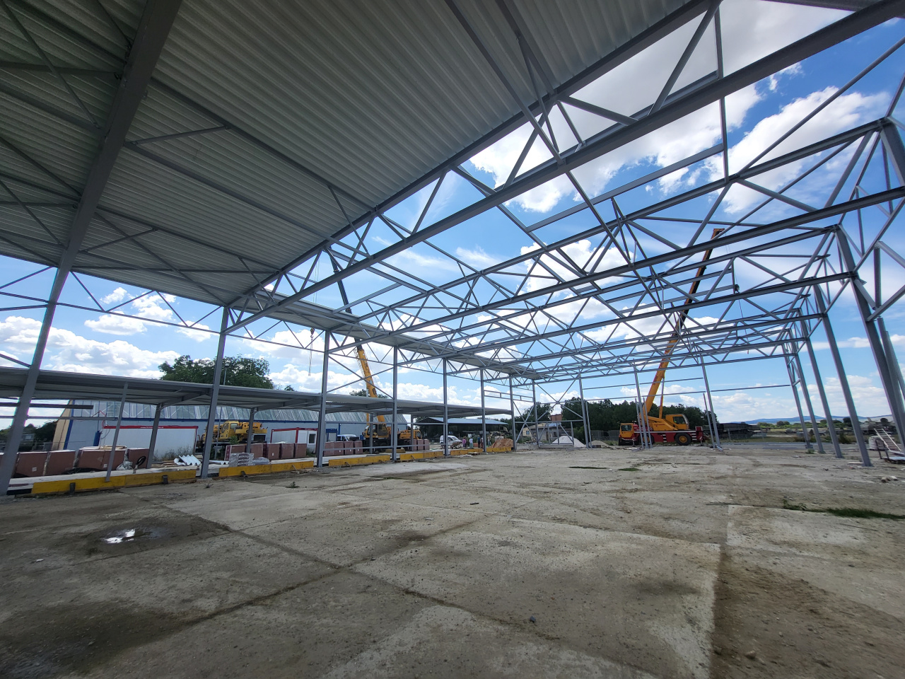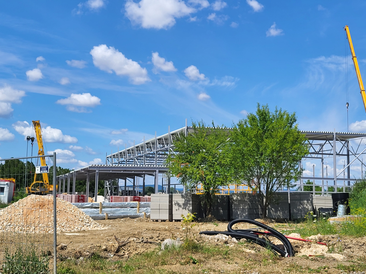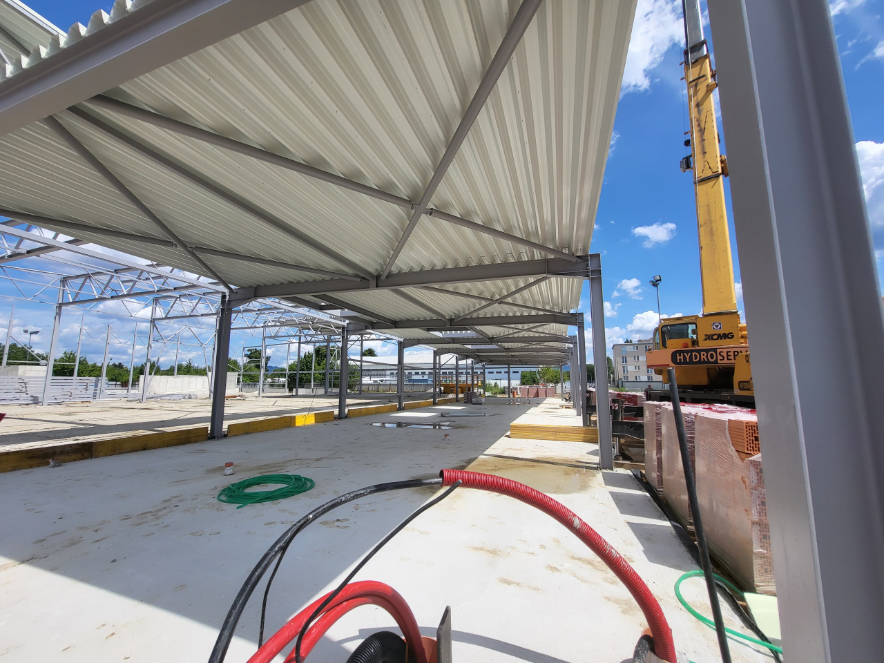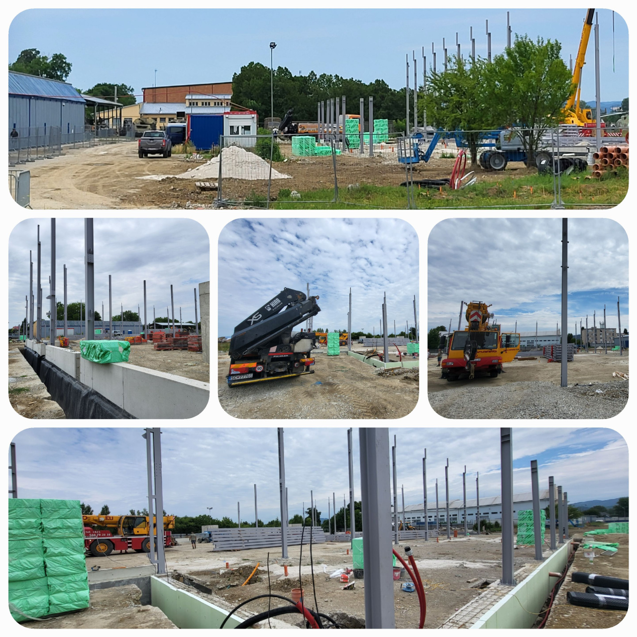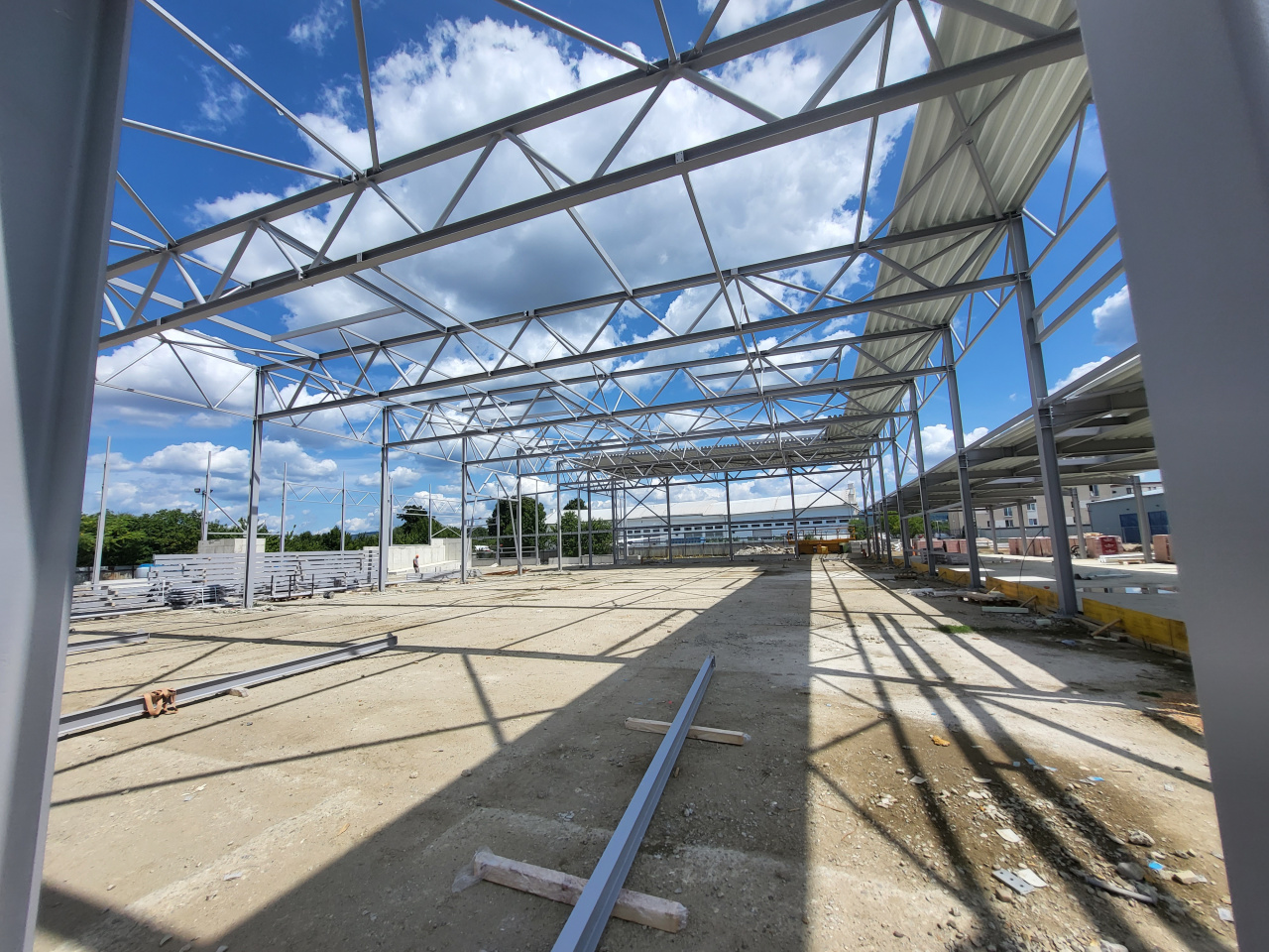 Stavebná spoločnosť Adifex, a. s. na základe schváleného projektu a harmonogramu realizovala v apríli až júli tohto roka viaceré stavebné práce. Napríklad vykonala búracie práce na základovej doske pre jednotlivé osadenia pätiek a základov pre oceľové stĺpy. Ďalej realizovala rozsiahle zemné práce ako výkopy pre základy, zakladanie jednotlivých základov, debnenie základových pásov a pätiek, osadenie výstuže do základových pásov a pätiek a samotnú betonáž základových pásov a pätiek. Na tieto stavebné práce nadväzovali odborné činnosti ako sú zhotovenie izolácie proti zemnej vlhkosti, nátery oceľových konštrukcií, dovoz a osádzanie oceľových konštrukcií, vykopanie rýh pre osadenie plynovej a vodovodnej prípojky, či položenie rozvodov plynovej a vodovodnej prípojky. V týchto týždňoch sa už kotvia oceľové piliere do betónových základov, na ktoré sa montuje oceľová nosná konštrukcia.