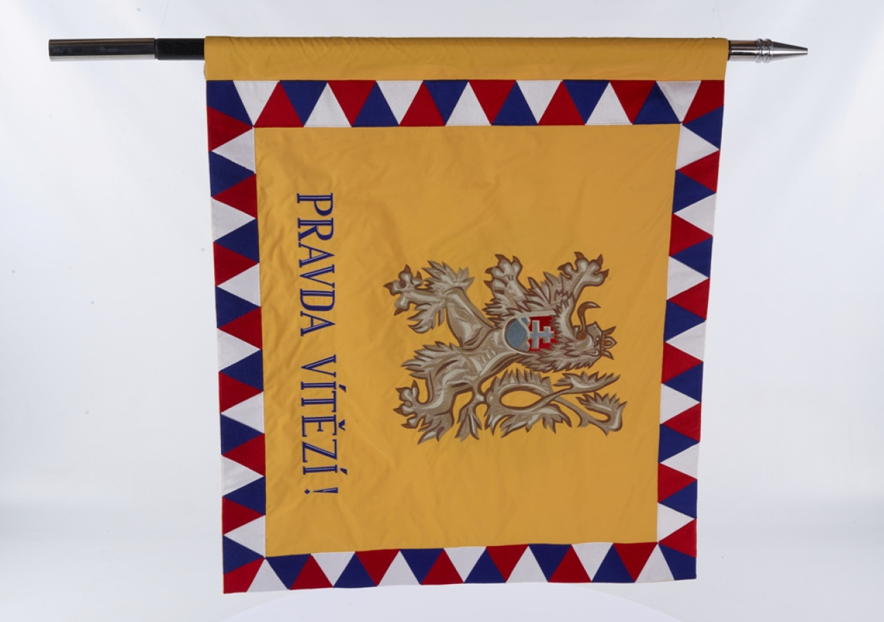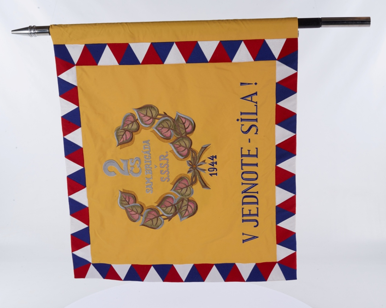 2. československá paradesantná brigáda v ZSSR mala svoju zástavu so sebou počas bojov v SNP i po vojenskej porážke Povstania a ústupe príslušníkov brigády do hôr. V decembri 1944 sa bojová zástava stratila. Aj napriek mnohým úsiliam jej strata nie je dodnes objasnená a spája sa s ňou viacero príbehov. Je nespochybniteľné, že chýbala medzi bojovými zástavami i počas prehliadky čs. armády v Prahe v máji 1945. Jej replika, vyrobená na múzejné účely firmou Velebný & Fam, s. r. o., v Ústí nad Orlicí, bola do zbierok VHM Piešťany zaradená v roku 2009. V súčasnosti je umiestnená v centrálnej expozícii Vojenské dejiny Slovenska 1914 – 1945 vo Svidníku, kde dokumentuje významné postavenie a úlohu brigády v bojoch o oslobodenie nášho územia.